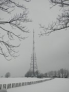 Wegweiser) links um die Sendermasten herum. Zu diesem Zeitpunkt